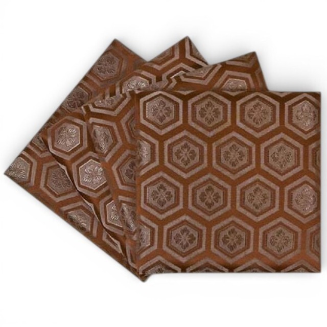 テーブルの脚に敷いて床や畳を守るおしゃれな脚敷です。 伝統の亀甲柄。 木彫りなど置物の台としても最適です。 サイズ:15x15cm カラー:茶 張地:ポリエステル・レーヨン 主材:ベニヤ板・ウレタン・フエルト ※展示現品